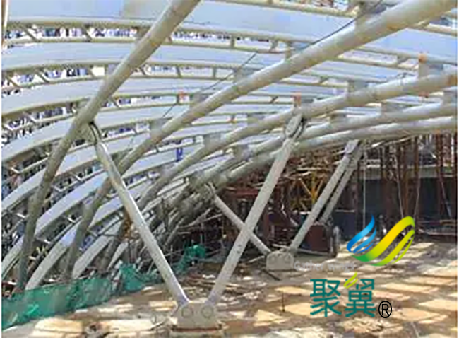(5)罩在辦公樓與演播樓上的是一個屋蓋外殼鋼結構,見圖4。在地上屋蓋鋼結構從±0.00標高起,將辦公樓和演播樓連為一體。外殼鋼結構主要支承體系有四大部分:1)鋼結構直接落地(圖5中黑粗線部分);2)辦公樓外掛支座(圖6);3)演播樓頂搖擺柱V形柱(圖7);4)空腔部分支承在拱橋上。另外,在演播樓7.0m標高處設有一圈鋼結構平臺,一端與演播樓鉸接,另一端與外殼鋼結構采用滑動支座連接(圖7)。圖8,9為搖擺柱V形柱和7m平臺的施工照片。