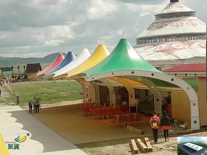 膜結(jié)構(gòu)建筑中的所使用的是一種耐久用、高強度的涂層織物—膜材,由織物和涂層復合而成,具有質(zhì)地柔韌、重量輕、厚度小、透光性好的優(yōu)點。對自然光吸收和透射能力、阻燃,具有良好的防火、耐久、氣密等特性;表面經(jīng)過氟素處理或二氧化鈦處理的膜材料抗老化性能好,具有較高的自清潔性能。