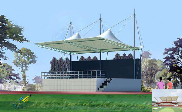 膜結構體育看臺保溫隔熱,單層膜材料的保溫性能大致相當于夾層玻璃,如果某建筑物對保溫性能要求較高,就不得不考慮采用雙層或多層膜,但雙層或多層膜又損害了建筑物的透光性能,一般來說雙層膜的透光率在4%~8%左右。透光性是膜建筑很吸引人的一個特點,有時很難讓人在二者之間作出選擇。為使上述矛盾達到協調統一,針對某個建筑物就必須尋求一種特定的方法,如尋求一種透光性好的內層膜材料等。
