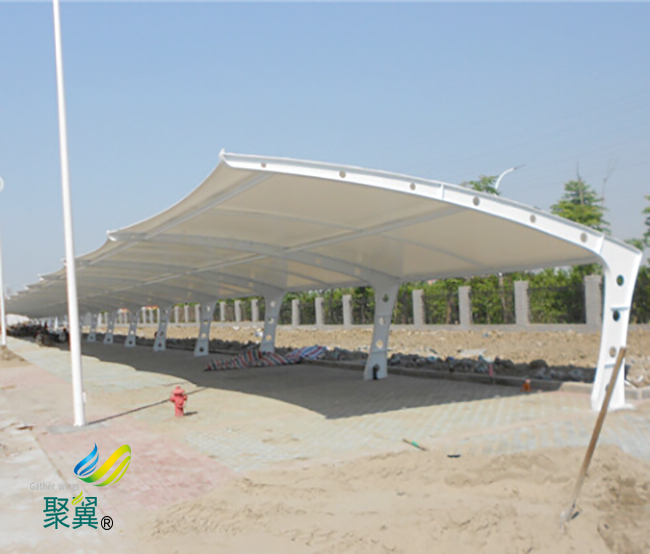 膜結構車棚膜材料屬于高科技時代下的新型材料,擁有了很好的張力、拉力,可以根據商家們的需求們以及地域環境的特殊,從而塑造不一樣的線條,組成各類形狀的膜結構車棚。膜結構車棚不僅具備了實用性和美觀性兩種優勢,和其他材質進行比較,它的成本付出更少。