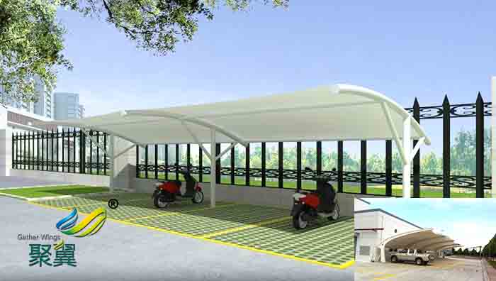 2.膜結構車棚經濟性:研究表明,長期露天停車的車輛,特性耗損速度比車棚內停車車輛快一倍。而選用膜結構雨蓬更能關愛您的愛車,緩解您愛車的老化速度。從經濟視角來說,投入很少卻大大增加您座騎的壽命。