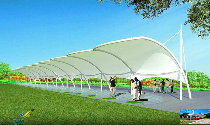 2.藝術性:膜結構停車棚除了具有普通遮陽篷不可比的經濟好用、防風雨功能外,還是一件雕塑、藝術品,給人以美的視覺感受。它的剛性和柔軟,它的豐富形狀,它的清潔美麗,讓人們眼前一亮,回味悠長。