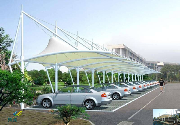 膜結構車棚建筑膜材具有輕質、柔韌、厚度小、透光性好;對自然光有反射、吸收和透射能力;它不燃(難燃或阻燃);具有耐久、防火、氣密良好等特性;表面經氟素處理(涂覆PVF或PVDF)的膜材、自身不發粘、有很好的自潔性能。