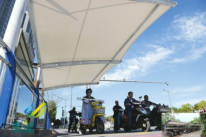 5、膜結構使用壽命及特點:膜結構車棚的篷布材質是膜材,而膜材的最大特點是強度高、耐久性好、防火難燃、自潔性好,不受紫外線影響,使用壽命長,一般 15-30年。具有高透光率,透光率為13%~20%,對熱能反射率73%,熱吸收量很少。正是因為這種劃時代丹材料的發明,使非機動車汽車停車棚成為現代化的永久建筑。